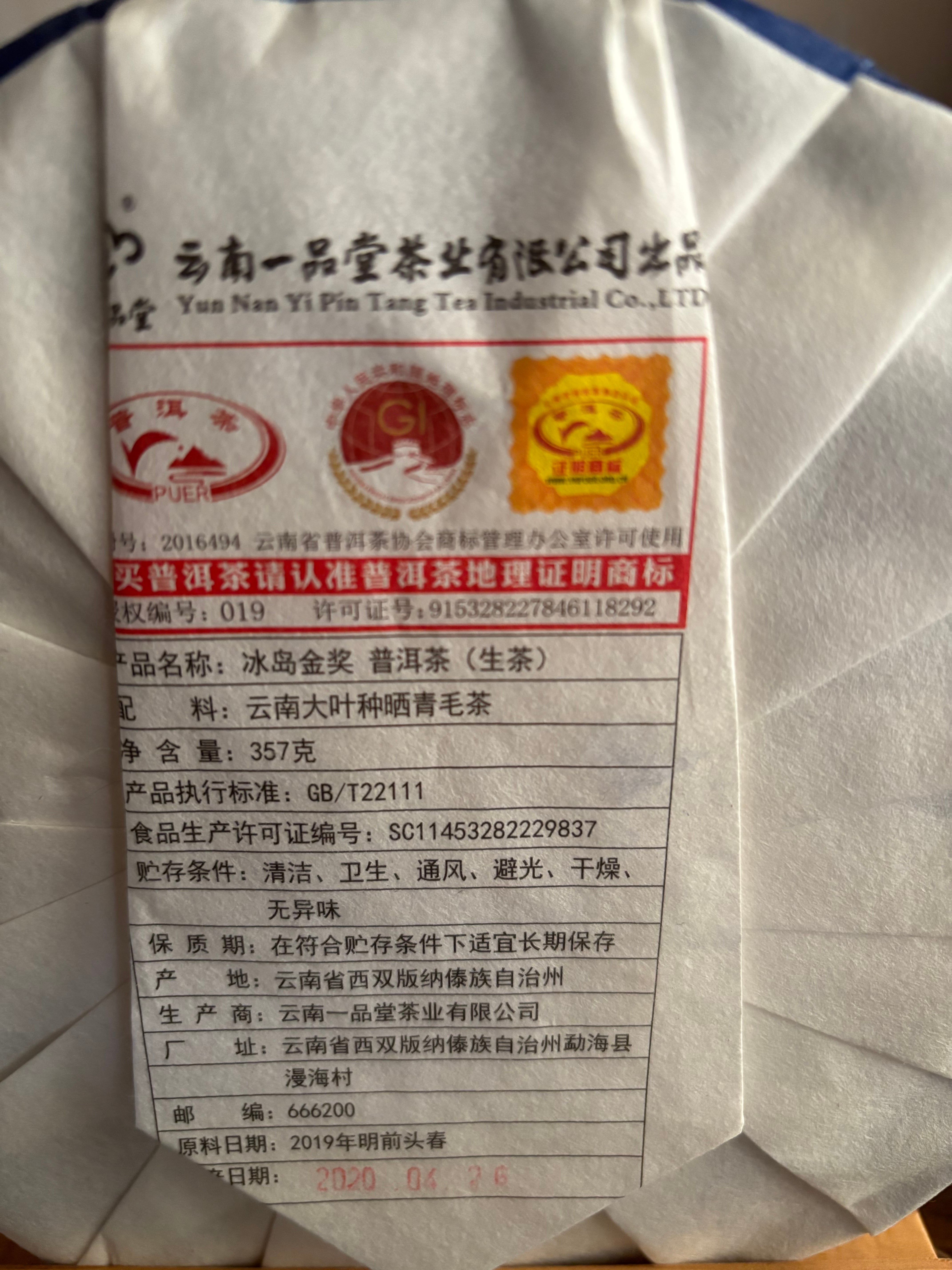 中国茶 台湾茶 プーアル茶生茶 一品堂 氷島金賞 357g